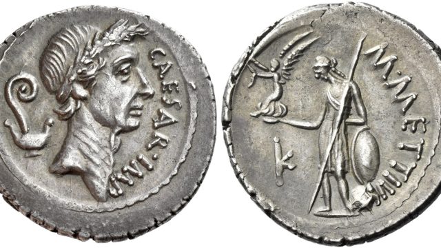Lot 66 – C. Iulius Caesar with M. Mettius. Denarius mid January-early February 44, AR