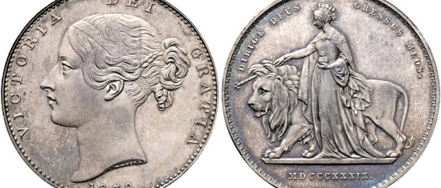 Lot 1610 – Victoria, 1837-1901. AR Pattern ‘Una and the lion’ Crown, 1839.