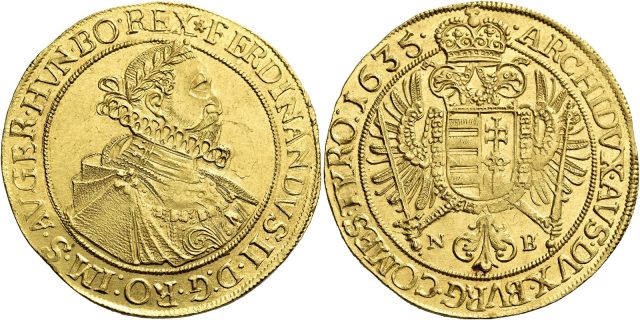 Lot 1008 – Ferdinand III, king of Hungary 1625, king of Bohemia 1627, Emperor 1637-1657. 100 Ducats 1629 » Auction 162 Estimate: 1'250'000 CHF Realized: 1'950'000 CHF