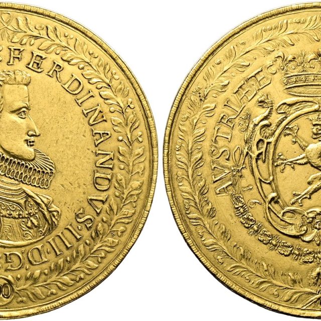Lot 1008 – Ferdinand III, king of Hungary 1625, king of Bohemia 1627, Emperor 1637-1657. 100 Ducats 1629
